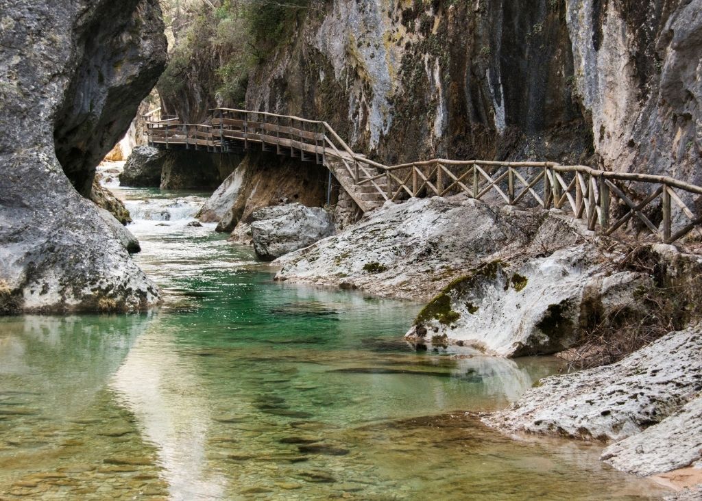 Entre paredes de roca y frondosos bosques, el río Borosa traza una de las rutas más conocidas del Parque Natural de las Sierras de Cazorla, Segura y Las Villas. En invierno, su caudal se multiplica y las cascadas del Salto de los Órganos rugen con más fuerza. El sendero, de unos 8 kilómetros hasta la Cerrada de Elías, es un espectáculo de pasarelas, túneles y puentes que despiertan la imaginación de pequeños y mayores.